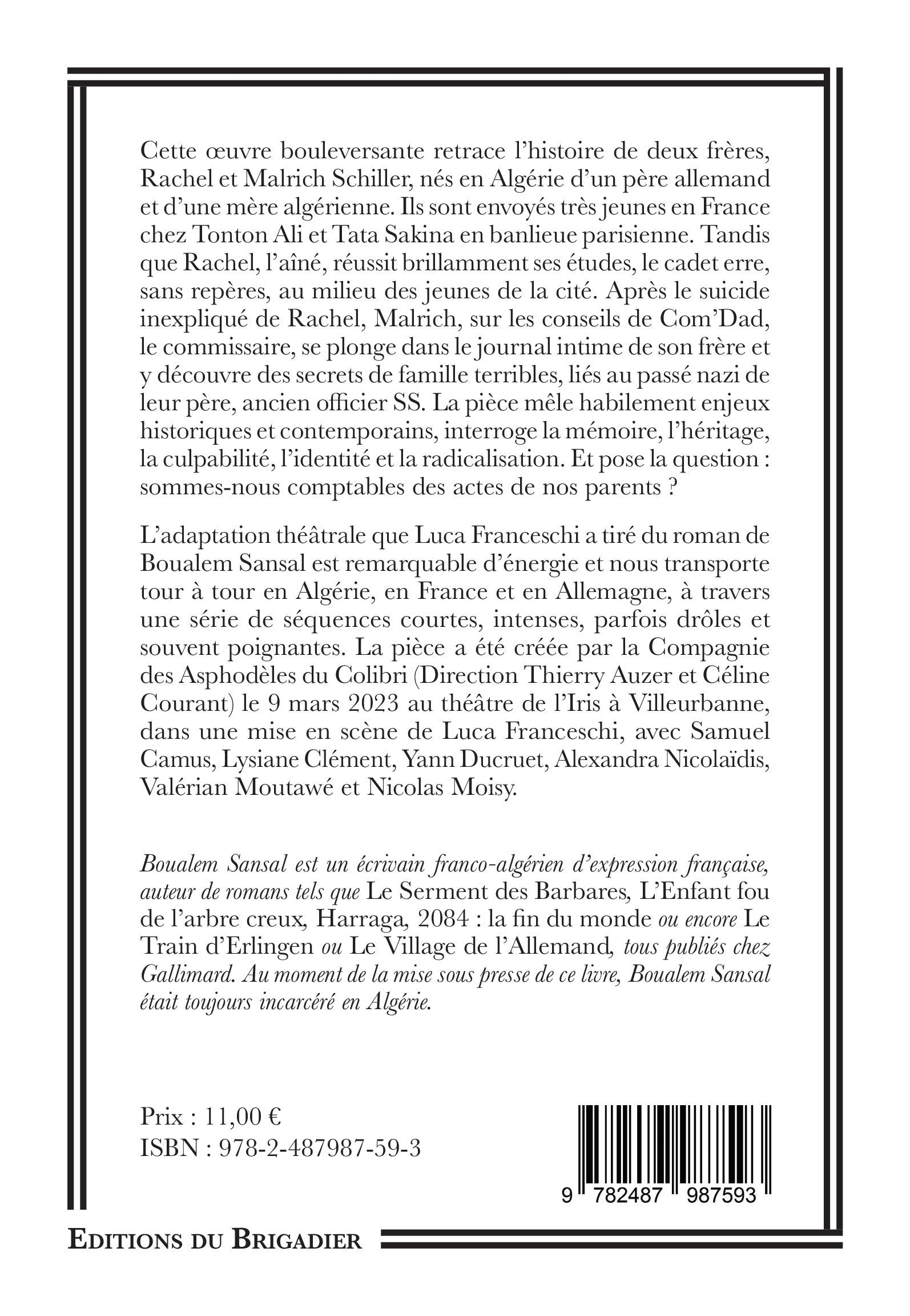 Cette œuvre bouleversante retrace l’histoire de deux frères, Rachel et Malrich Schiller, nés en Algérie d’un père allemand et d’une mère algérienne. Ils sont envoyés très jeunes en France chez Tonton Ali et Tata Sakina en banlieue parisienne. Tandis que Rachel, l’aîné, réussit brillamment ses études, le cadet erre, sans repères, au milieu des jeunes de la cité. Après le suicide inexpliqué de Rachel, Malrich, sur les conseils de Com’Dad, le commissaire, se plonge dans le journal intime de son frère et y découvre des secrets de famille terribles, liés au passé nazi de leur père, ancien officier SS. La pièce mêle habilement enjeux historiques et contemporains, interroge la mémoire, l’héritage, la culpabilité, l’identité et la radicalisation. Et pose la question : sommes-nous comptables des actes de nos parents ?