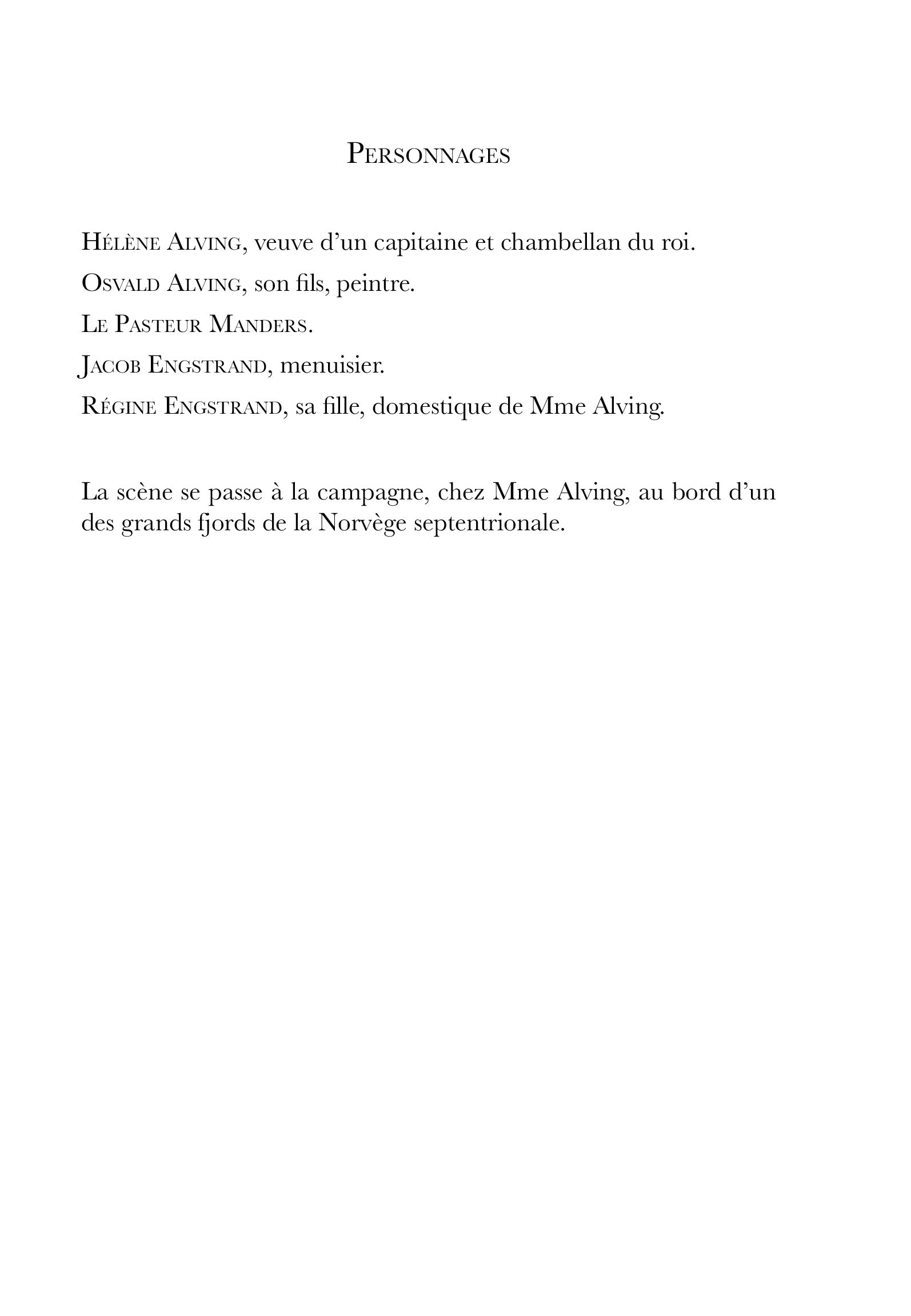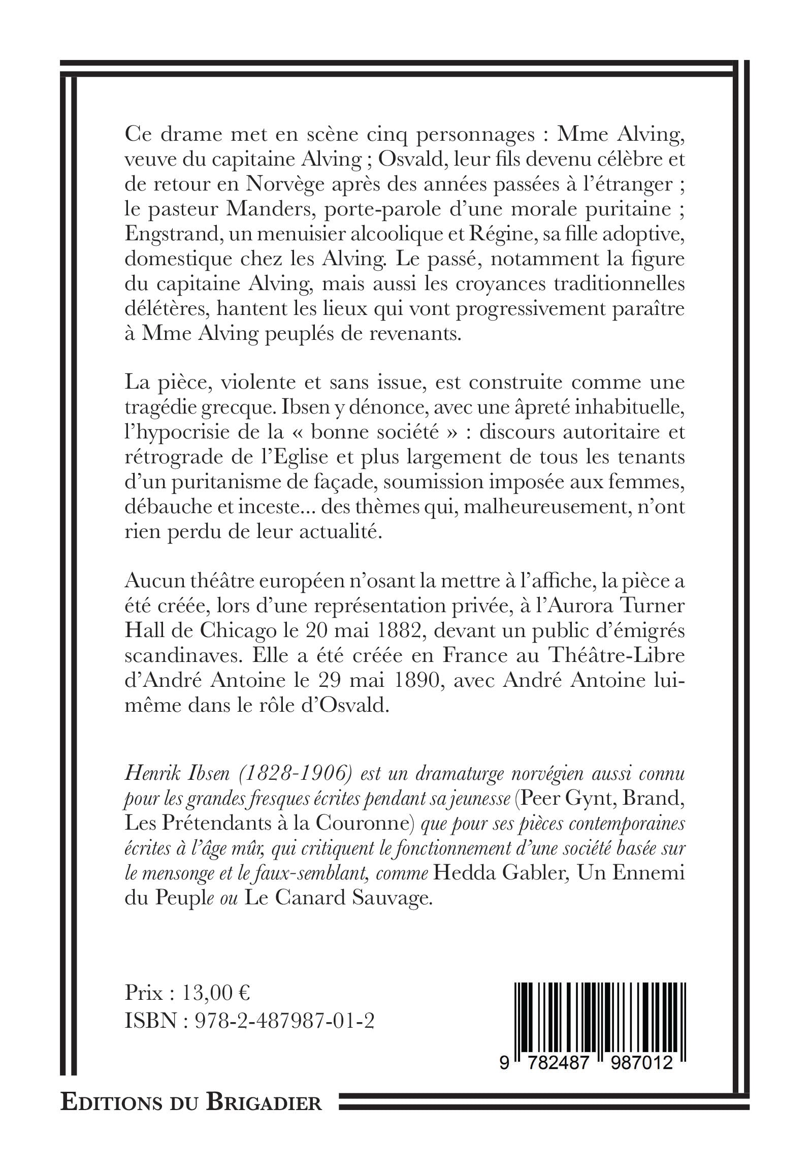 Ce drame met en scène cinq personnages : Mme Alving, veuve du capitaine Alving ; Osvald, leur fils devenu célèbre et de retour en Norvège après des années passées à l’étranger ; le pasteur Manders, porte-parole d’une morale puritaine ; Engstrand, un menuisier alcoolique et Régine, sa fille adoptive, domestique chez les Alving. Le passé, et notamment la figure du capitaine Alving, mais aussi les croyances traditionnelles délétères, hantent les lieux qui vont progressivement paraître à Mme Alving peuplés de revenants.